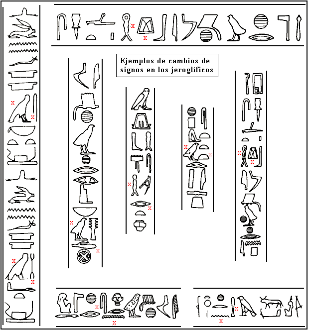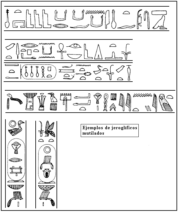 En varias ocasiones en la historia de Egipto, los cartuchos de un gobernante muerto fueron sistemáticamente mutilados o removidos de monumentos, en un acto de venganza del sucesor. Incluso los dioses no eran inmunes a estos ataques. Cuando el rey Akhenaton instituyó la nueva religión del disco solar y abolió el antiguo régimen, ordenó, entre otras cosas, que el nombre del principal de los dioses, Amun, fuera borrado de los monumentos del país, cosa que todavía puede apreciarse en las piezas que han llegado hasta nosotros. De forma similar, el monumento de una persona a veces pasaba a ser de otra. El acto esencial para dicha "usurpación" era el cambio de nombre; el nombre original era quitado y el nuevo puesto en su lugar; el monumento quedaba tal cual, simplemente con ese pequeño cambio. En la imagen inferior hay algunos ejemplos marcados de cambios de signos. Los signos cambiados van marcados con una cruz.