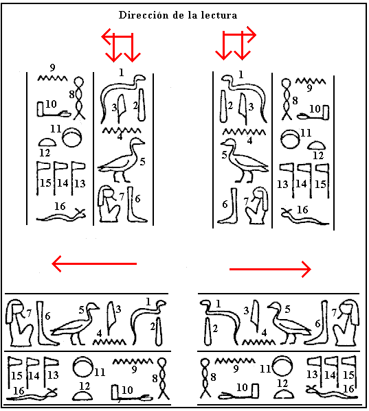 Orientación de la escritura En períodos anteriores el repertorio en uso era siempre menor de 1.000 (como 700 en el período medio egipcio.) Una inscripción jeroglífica puede estar realizada en columnas o en líneas horizontales, siendo la primera más antigua que la segunda. La secuencia de signos es continua. No hay signos de puntuación o espacios que indiquen división entre palabras. La orientación es usualmente hacia la derecha, con los signos individuales y la inscripción de la cual forman parte a ser leída de izquierda a derecha, y lo superior teniendo precedencia sobre lo más bajo. La orientación hacia la izquierda también ocurre, pero solamente bajo ciertas normas: fue empleada, por ejemplo, en inscripciones que acompañan figuras que miran hacia la derecha o que proveen balance o simetría en una composición de gran tamaño. Ejemplos de inscripciones en columnas orientadas en ambas direcciones se dan al lado. La dirección de la escritura se indica así como el orden en el que los signos han de ser leídos. Como puede verse, una clave para saber la dirección de la escritura viene dada por ciertos signos, especialmente humanos o animales, que tienen un anverso y un reverso fácilmente reconocible. |