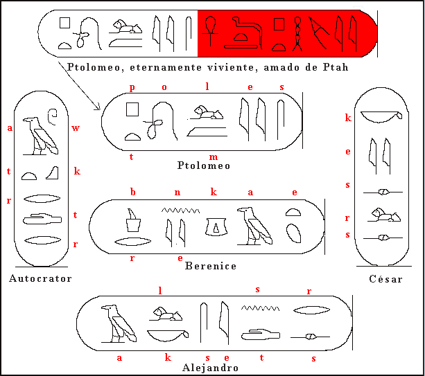 Los cartuchos donde se hallaban alojados los nombres de Cleopatra y Ptolomeo fueron las claves que le dieron la solución a Champollion para descifrar el enigma. En la figura inferior podemos ver varios cartuchos con nombres de personajes y títulos reales.