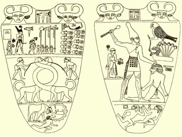 Los orígenes de este sistema de escritura son desconocidos. Para los egipcios era una invención de los dioses, en particular de Thoth, el escriba divino, quien se describe a sí mismo como el "señor de la escritura". Las más antiguas inscripciones halladas proceden de Hierápolis, a unos 70 Kms. al sur de Tebas, en el Alto Egipto. Se trata de una cantidad de paletas de pizarra, de las cuales la más famosa es la llamada "Paleta de Narmer", llamada así por la creencia de que los dos símbolos centrales en la inscripción superior, tanto en el anverso como en el reverso, representan signos que un egipcio más moderno podría leer como "Narmer". La paleta ha sido datada hacia el año 3.000 antes de Cristo. La escena central del anverso (figura derecha) muestra a un rey egipcio en el acto de forzar de rodillas a un enemigo. La escena de la derecha exhibe un halcón, probable símbolo del rey como dios Horus, llevando a un hombre con una cuerda desde la región del Delta, simbolizado por la cabeza de un hombre y seis papiros.